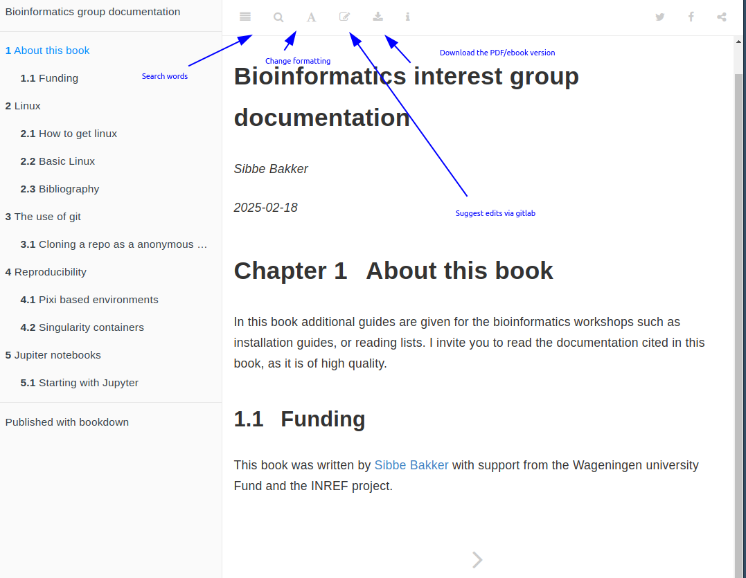You can use this book as the start off point in your bioinformatic journey. You will not find everything explained here, but you’ll find links to sources that will set you on your way. The online versions has controls for accessibility (Figure below).